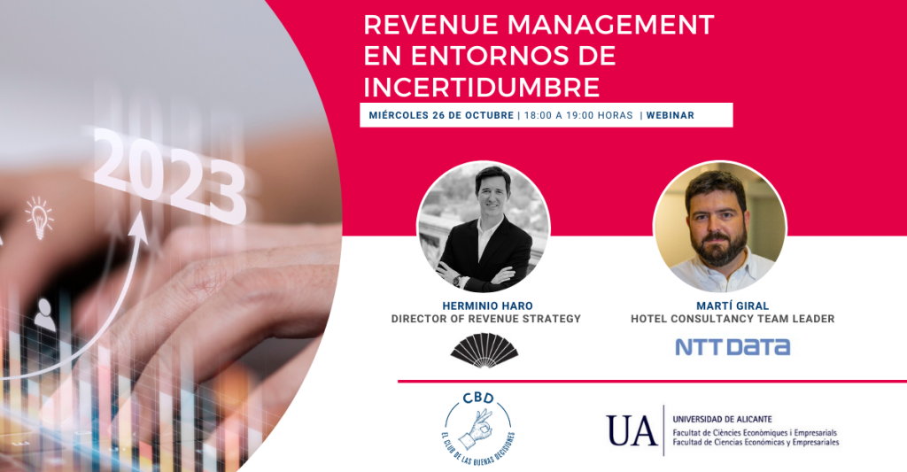 El próximo miércoles 26 de octubre de 18:00 a 19:00 horas llevaremos a cabo el Webinar «Revenue management en entornos de incertidumbre» que forma parte de un nuevo ciclo de «OpenTalks Estrategias de éxito en Turismo», enmarcado bajo el paraguas del Programa Superior en Total Revenue Management de la Universidad de Alicante.