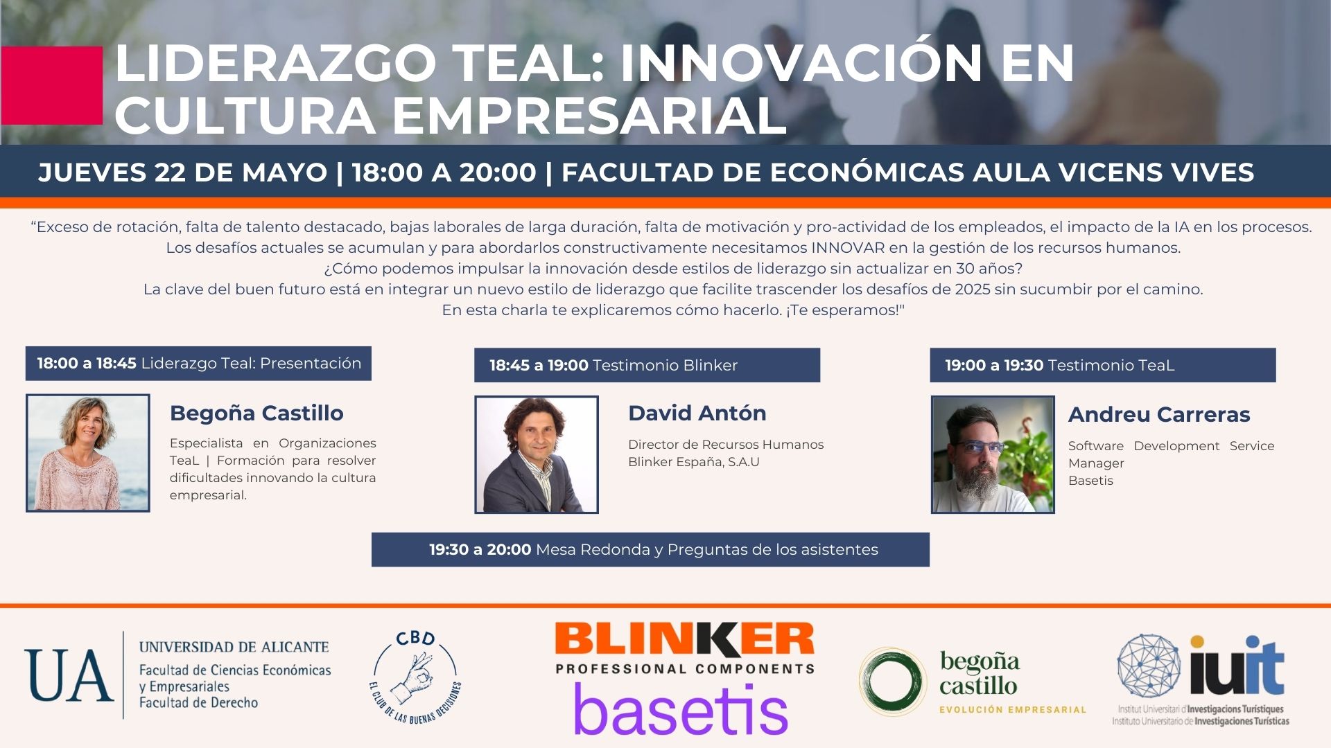 El próximo jueves 22 de mayo de 18:00 a 20:00 se llevará a cabo la jornada: LIDERAZGO TeaL : Innovación en Cultura Empresarial en el Aula Vicens de la Facultad de Ciencias Económicas y Empresariales de la Universidad de Alicante. Que los desafíos organizacionales se nos acumulan es una evidencia: exceso de […]